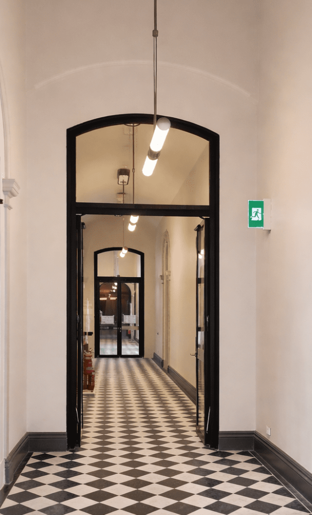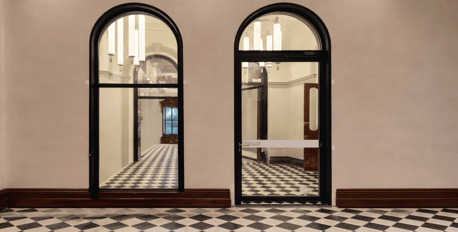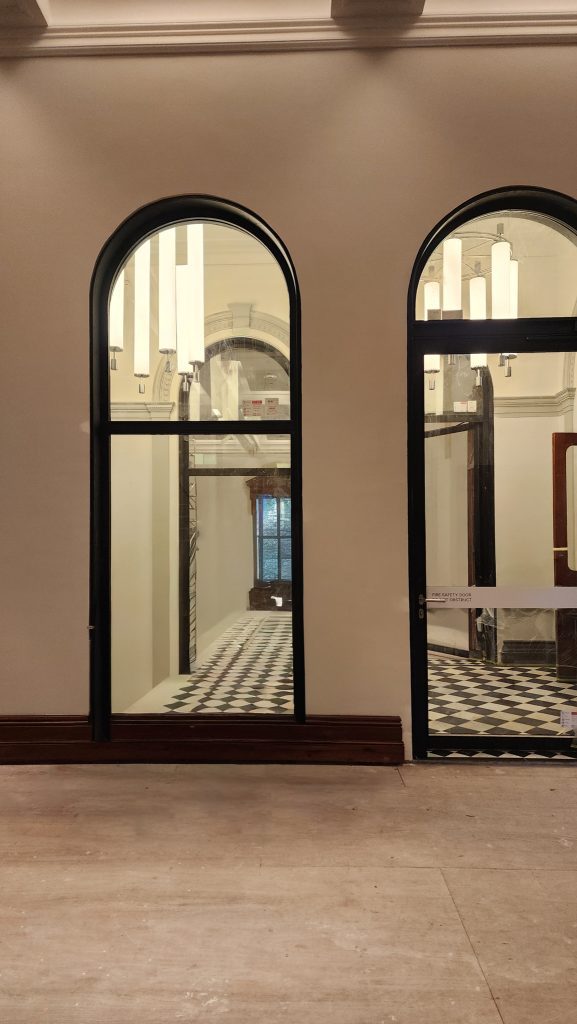 These huge -/60/30 fire doors with curved top lites and side lites were used to upgrade this renown heritage building to allow the use of the existing escape pathways and stair ways to be used as certified fire rated egress pathways. These beautiful installations retained the original heritage feel, while still providing the necessary fire protection to meet current building standards.