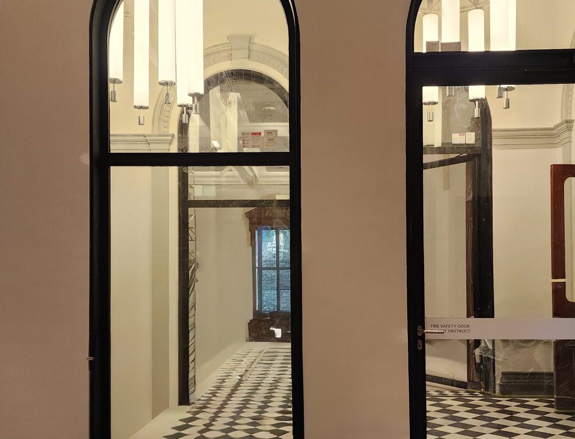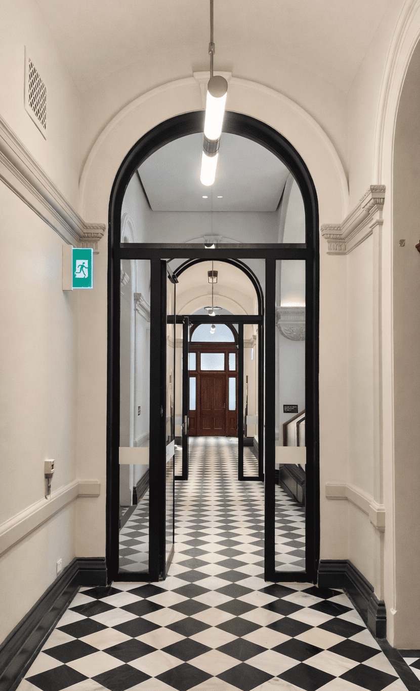 These huge -/60/30 fire doors with curved top lites and side lites were used to upgrade this renown heritage building to allow the use of the existing escape pathways and stair ways to be used as certified fire rated egress pathways. These beautiful installations retained the original heritage feel, while still providing the necessary fire protection to meet current building standards.