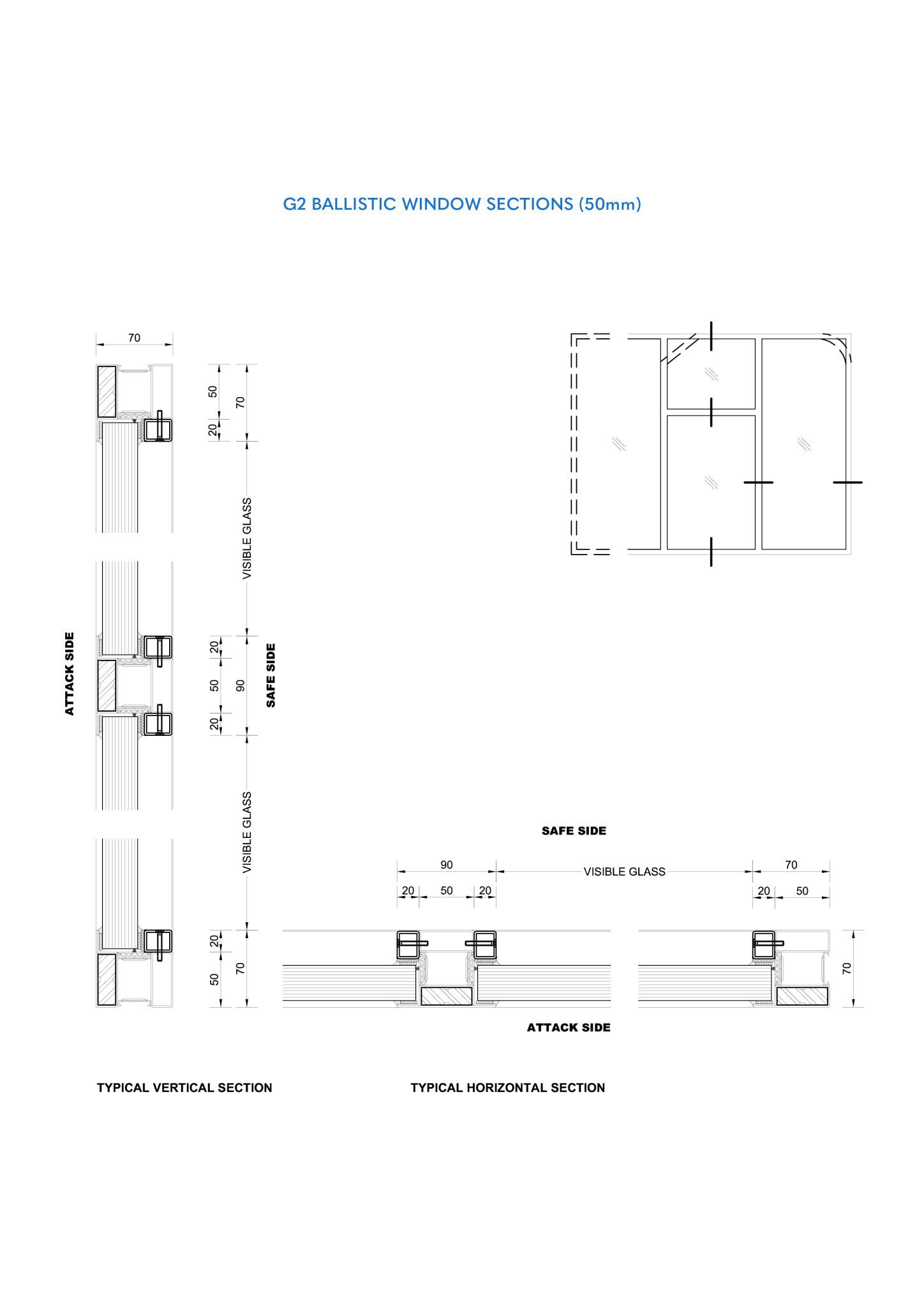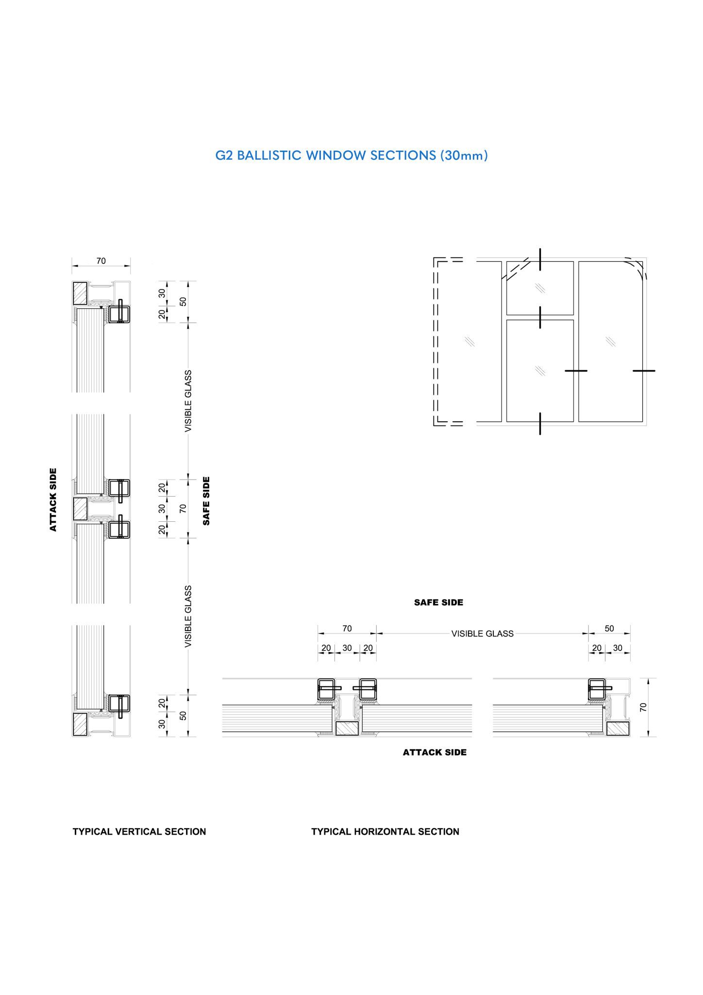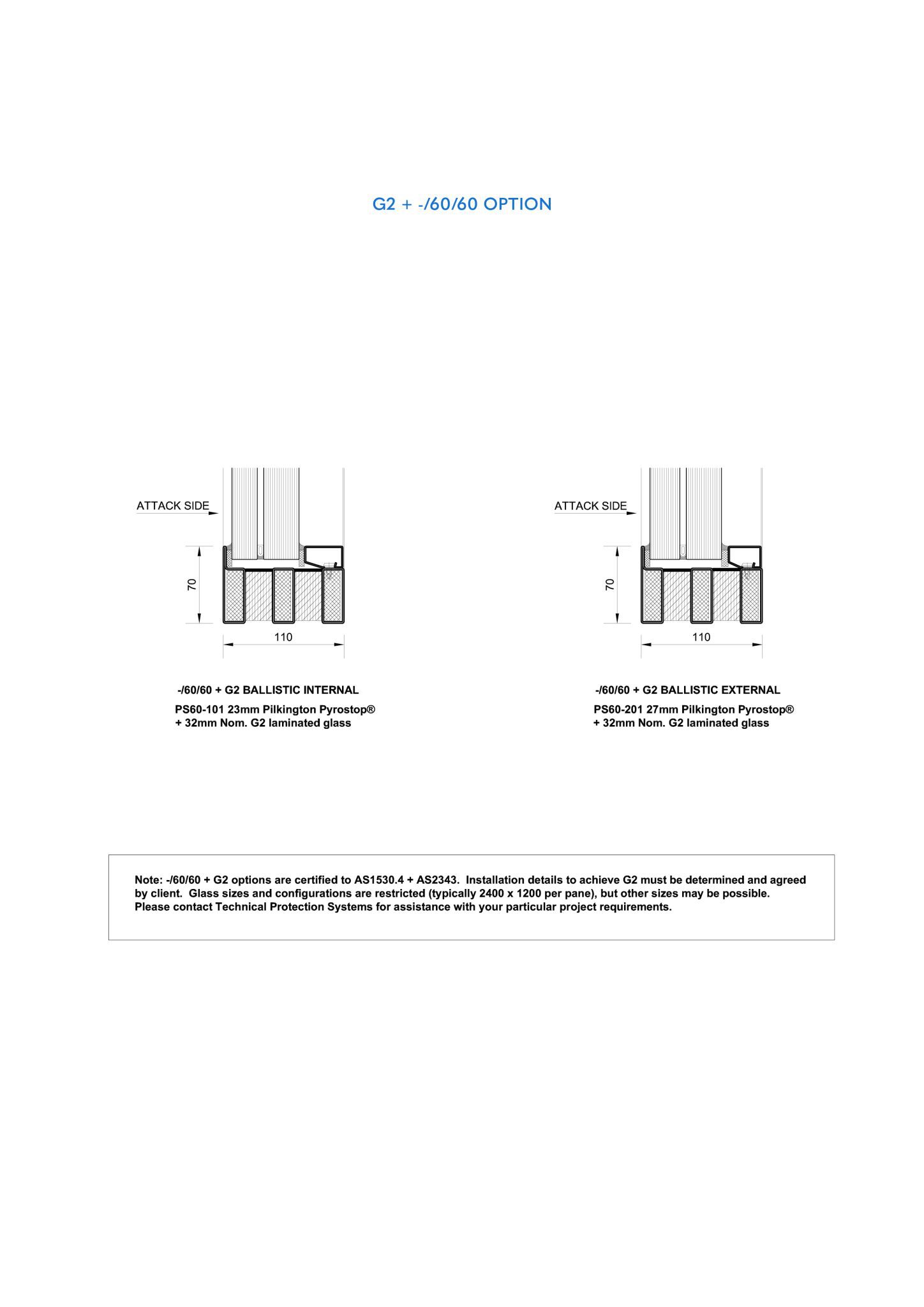 Technical Data Glass Thickness FRL Application Max visible glass dim (mm) Max glass pane area (m2) Weight (Kg/m2) G2 Ballistic 30-40mm Up to -/60/60 Internal / External +2376 +2.8m2 Varies