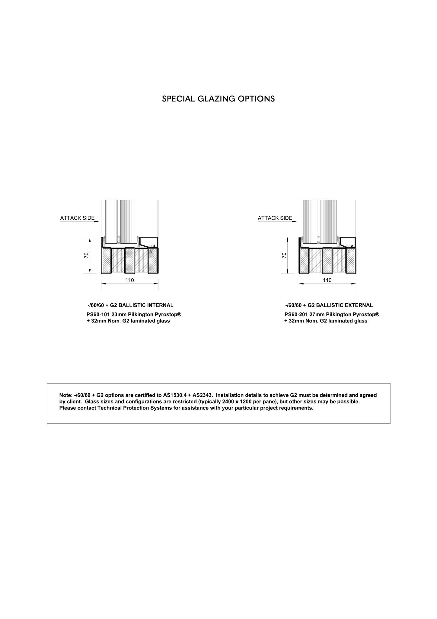 Fixed windows up to 3011 x 1608 (-/60/60) or 2946 x 1437 (-/60/30) for each lite Fire resistance to -/60/60, or -/60/30 Forster Fuego Light 65 x 50 steel insulated framing system Single and multi-panel applications – unlimited continuous length Suitable for internal or external application Available in powdercoat or paint finish 304 grade stainless steel available on request Easily integrated with TPS -/60/30 glazed fire doors Very high sound reduction Pilkington Pyrostop ® Grade A impact rated to AS2208 Curved heads, angles, circles available Double glazing available for improved energy/shading performance Available with G2 ballistic (AS2343) ballistic rating System also available as -/120/120, -/90/90, (contact TPS for more information) Suitable for integration with TPS -/60/30 glazed sliding door system (contact TPS for more information) Full DWG drawings and architectural support available (please contact TPS for assistance) Continuous curtain walls possible using Forster Thermfix Vario fire rated curtain wall system Full glass data available from technicalprotection.com.au