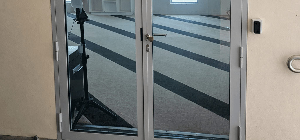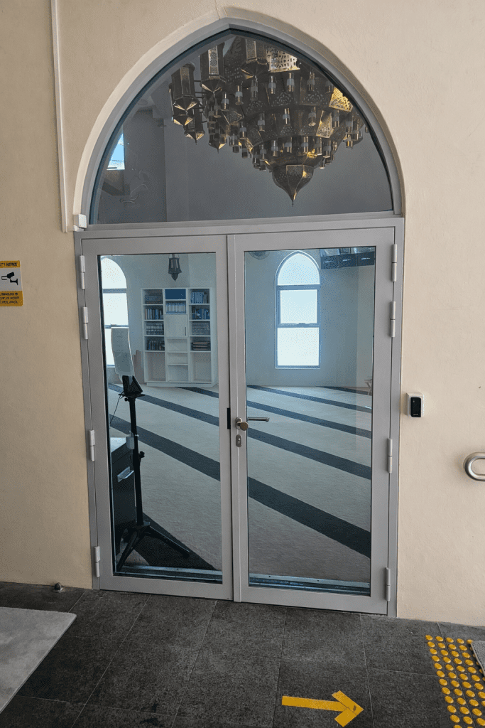 G2 ballistic glazing installed into religious centre, consisting of G2 hinged doors, and arched top lite.